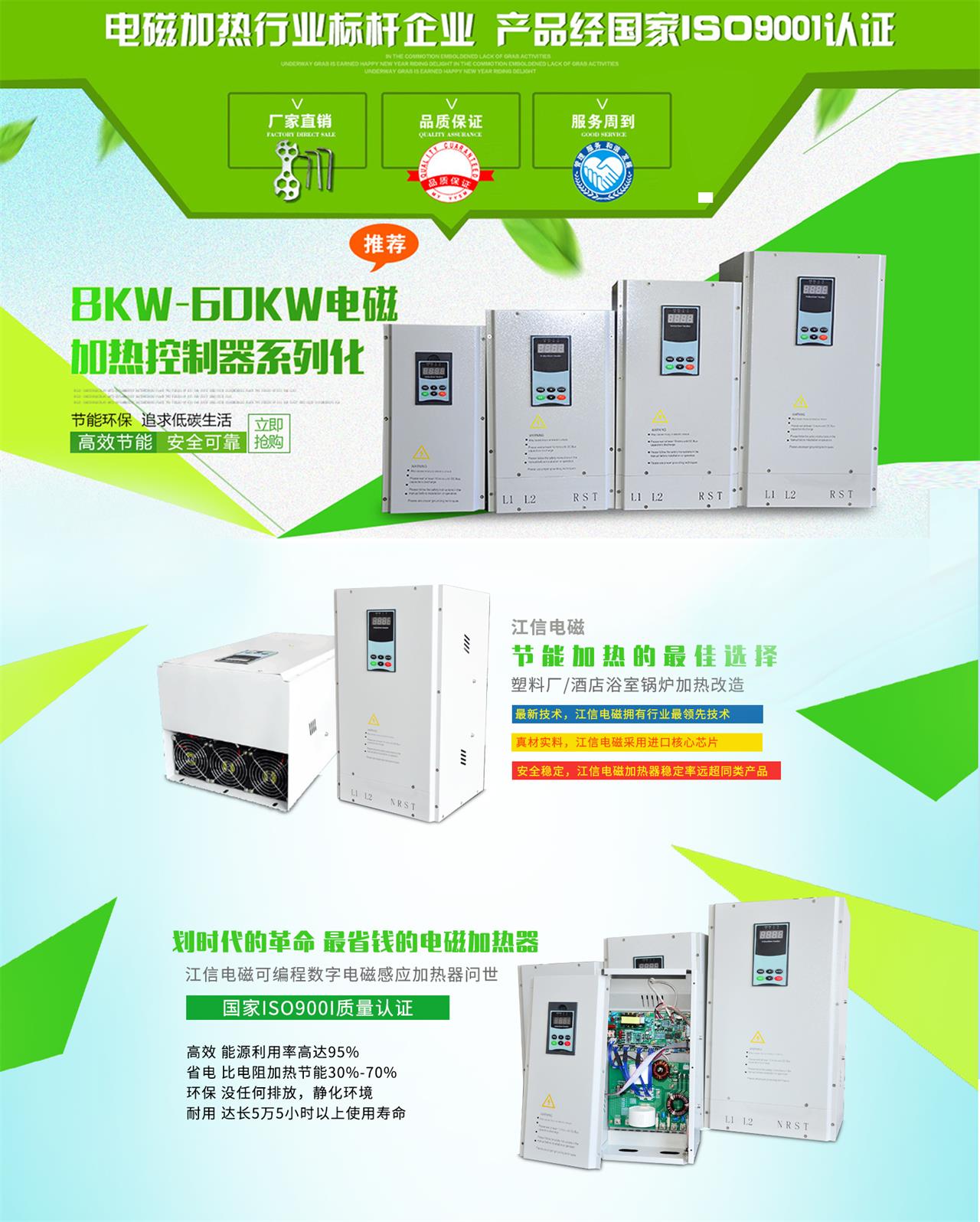 ? 江信電磁技術精英,歷經幾年時間研究,開發出一系列全數字電磁加熱節能控制器產品。多年來通過對多家客戶,各種塑膠機械設備鍋爐改造導熱油加熱等設備進行加熱節能改造實驗證明,電磁加熱節能控制器已經可以作為傳統電熱產品劃時代的替代品。產品已經通過歐盟CE安全及電磁兼容方面的認證,對人體健康及機械設備的電控部分沒有影響。穩定情好,無干擾,明顯有效提高工作效果和企業競爭效率。